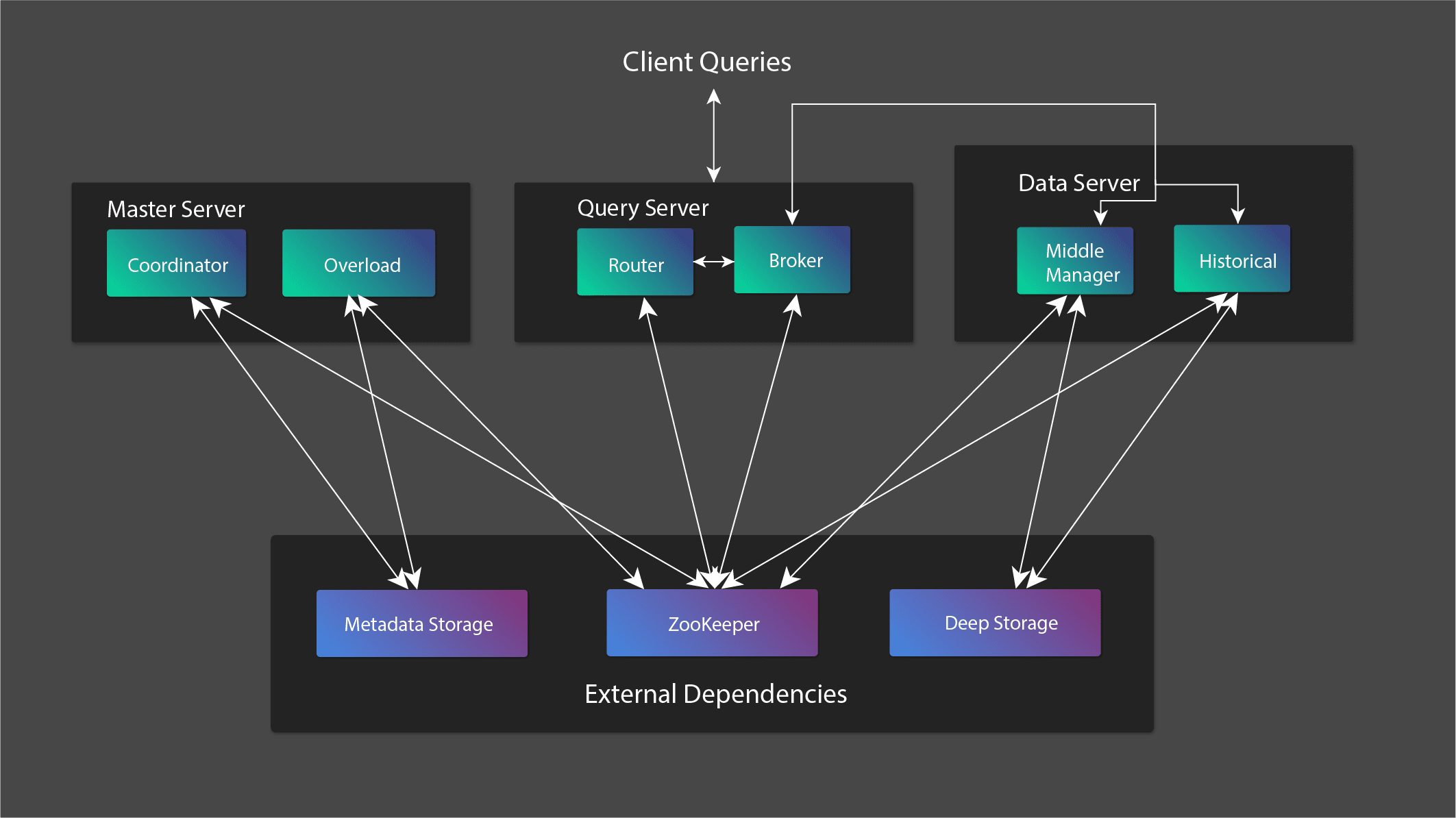 Apache Druid follows a distributed, microservice-based architecture. The architecture allows for scaling different components based on the system’s needs.