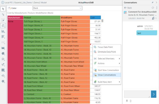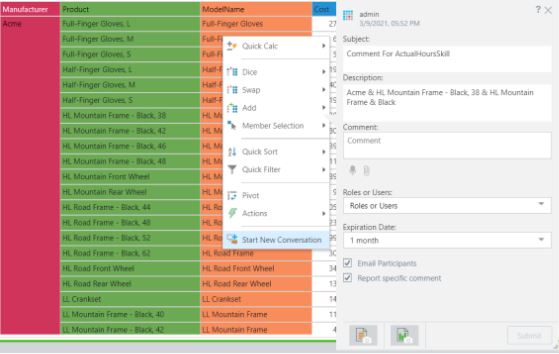 We can click a specified element in the report and enable Actions that can be defined. We can review data and start conversations with other relevant users. We can also create conversation threads and invite other users.