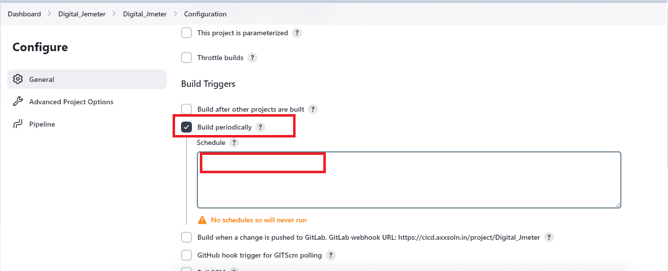 Define Pipeline Script: Configure the pipeline script to execute the JMeter test at regular intervals using a cron expression.