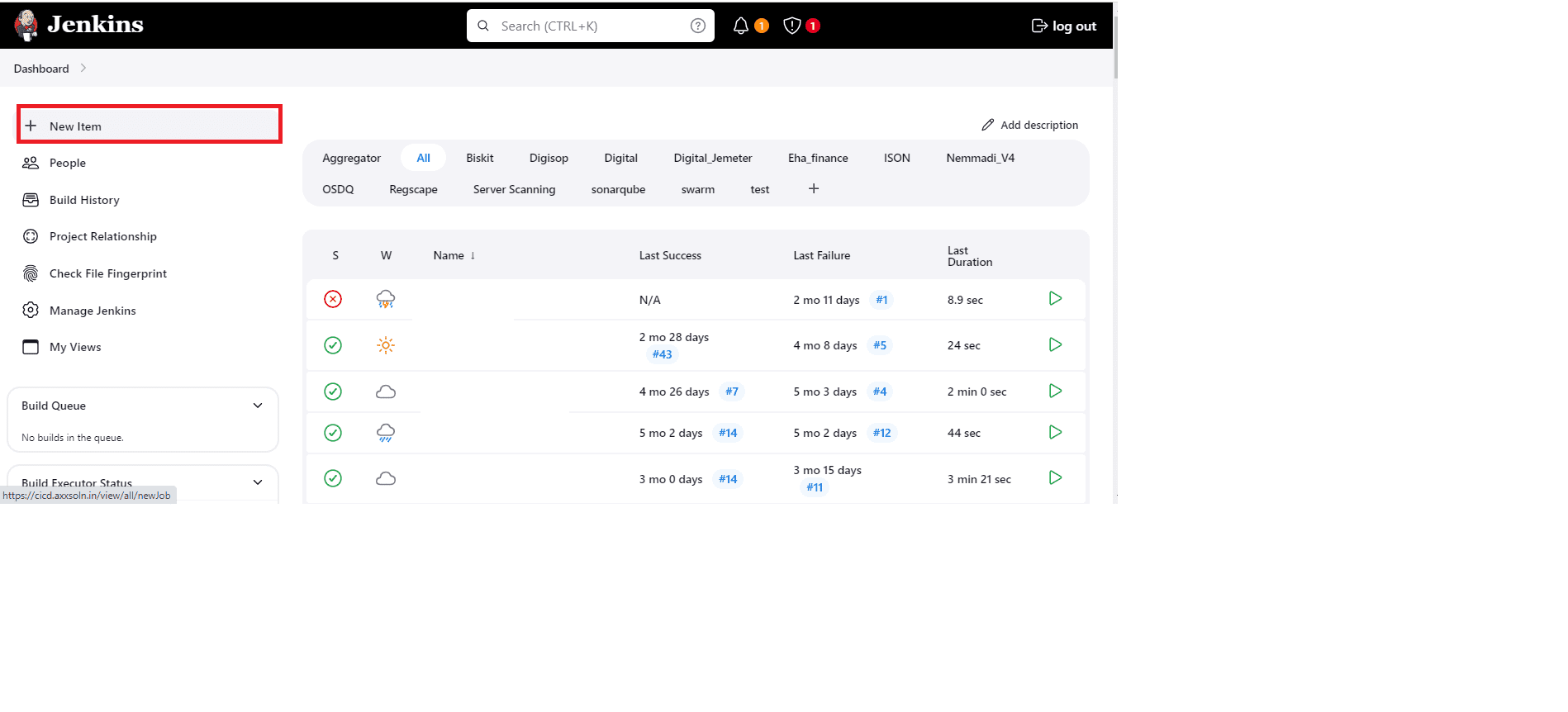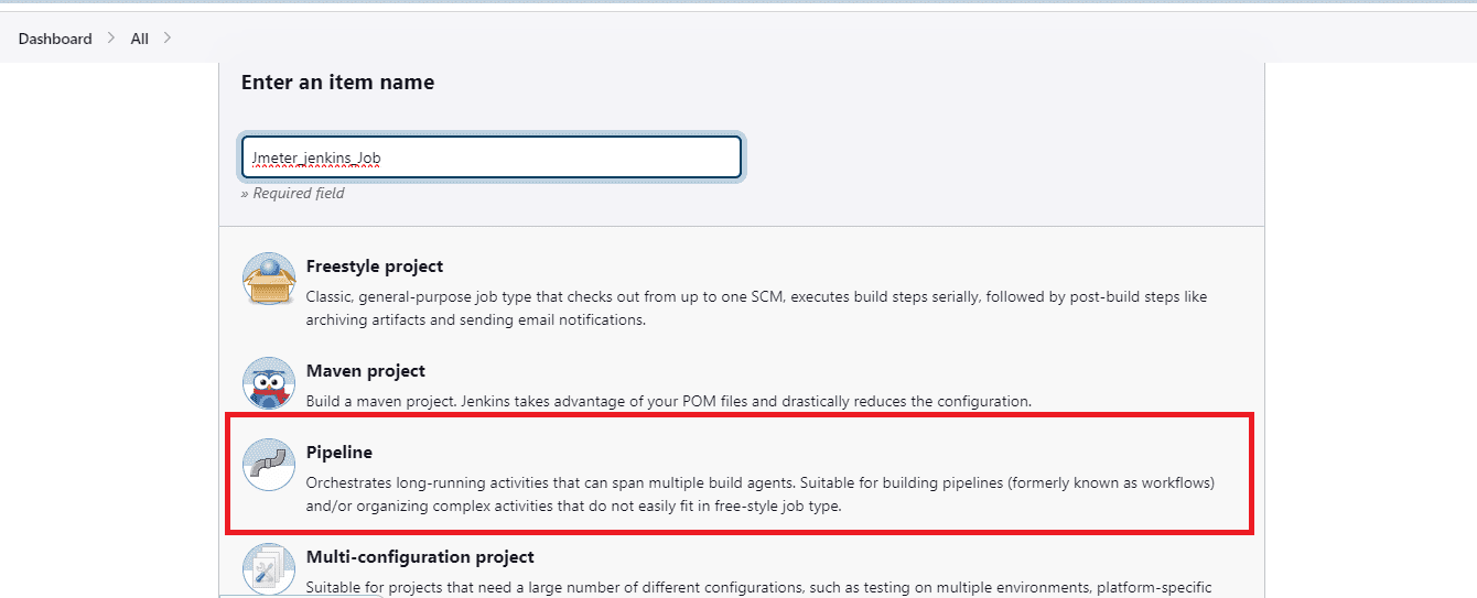 Create a New Pipeline Job: A new pipeline job should be created to orchestrate the performance testing process. Click on new item to create a pipeline job and select pipeline option.