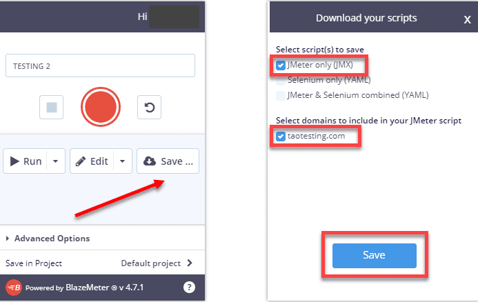 Now Blaze Meter has recorded the scripts. To save it in. jmx format, click on save, check the Jmeter only box and click on save as shown in the screenshot below.
